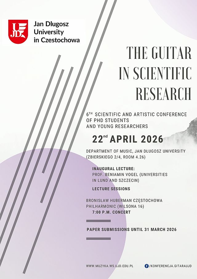 We are extremely pleased to announce that the 6th Scientific and Artistic Conference of PhD Students and Young Researchers "The Guitar in Scientific Research" is scheduled to take place on the 22 April 2026. The event is organised by the Department of Music at Jan Dlugosz University in Czestochowa.